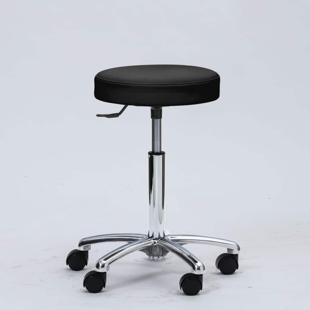 Der klassische Rundsitz in ø 34 cm ist bezogen mit Basis-Kunstleder Dakota schwarz. Ausgestattet mit einer Hebelmechanik zur Höhenverstellung, langer Gasfeder und kleinem Basis Fußkreuz, beides in silber. Die ungebremsten Standard Rollen in Ø 50 mm haben Radkern aus Polyamid mit Polyurethanbandage.
